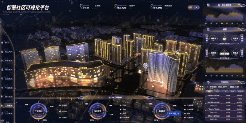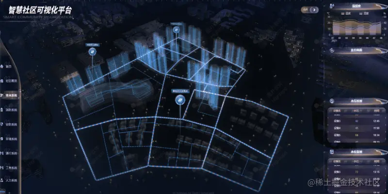 图扑软件(Hightopo)运用自主研发的 HT for Web 产品,通过联动现场智能化物联设备,将社区排水、消防、安防、环境、通行、工单、人力等各子系统高度整合。利用图扑二三维可视化引擎,合力打造智慧社区可视化平台,构建全域、多维、一体的社区综合管理体系。补齐物业管理过往存在的短板,创新服务模式,强化社区管理效率,让社区服务更有温度。