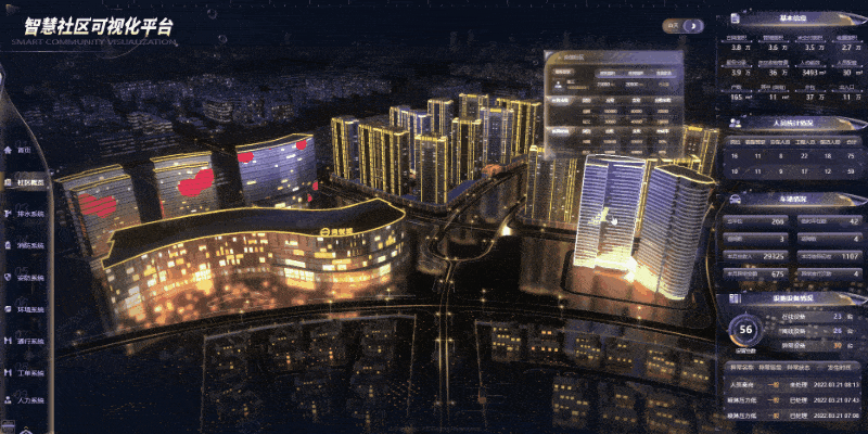 图扑软件通过借助 HT 技术赋能,对各子系统的数据进行整合,接入 HT 可视化平台,将社区的基本信息、物业人员、停车场、设备设施等主要信息结合社区三维场景进行展示。通过交互可将三维场景视角聚焦到所选小区,同时概览数据细化至小区级别,方便用户对整体社区概况快速初步了解。