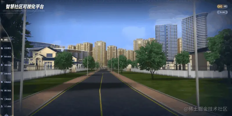 基于 Web 3D 开发技术搭建的虚拟智慧社区,将社区内的建筑、道路、绿化等各种设施设备按照 1:1 建模还原。通过图扑软件 HT 自研引擎,并结合 PBR 物理渲染材质系统,渲染出真实的小区环境效果。
