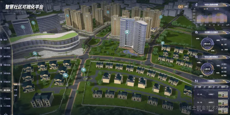 图扑软件依托自主研发的 HT for Web 产品,结合智慧社区运营管理模式,将社区内各子系统进行整合,利用三维可视化优势,助力社区以“一张图”实现智慧社区可视化管理,有效避免以往小区因“孤岛式”管理而导致成本高、效率低等问题。