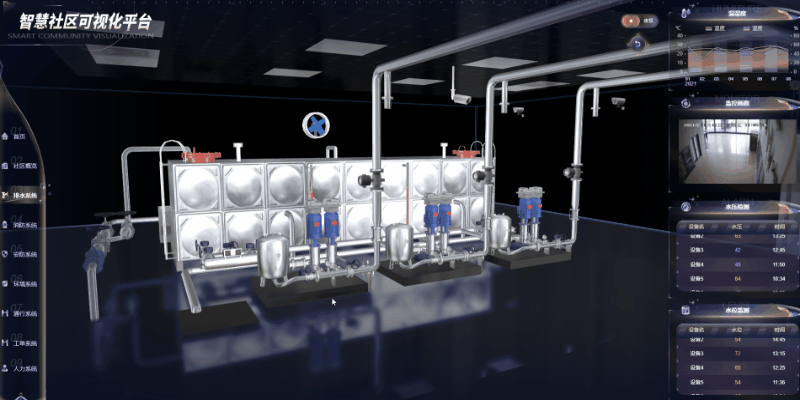 在居住小区内部,日常生活中使用大量的水,排水系统作为非常重要的组成部分,能够确保社区内居民的正常用水,从而享受舒适的家居生活。图扑软件(Hightopo)通过推出基于管线可视化的独特算法用于社区内排水管网生成,并辅以流向动画,实现直观查看社区内排水系统管道布局与走向。结合排水设备各项监测数据附于面板两侧,让用户对社区排水情况一目了然。