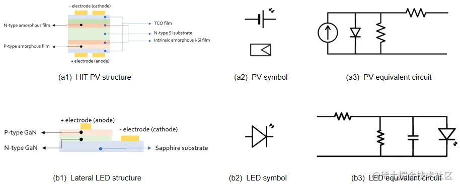 图1 光伏电池(HIT)和LED的结构、符号和等效电路
