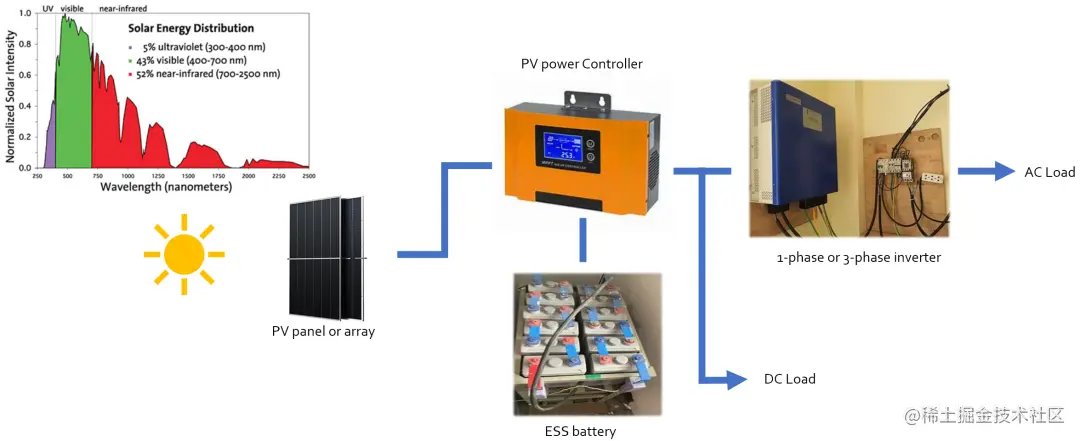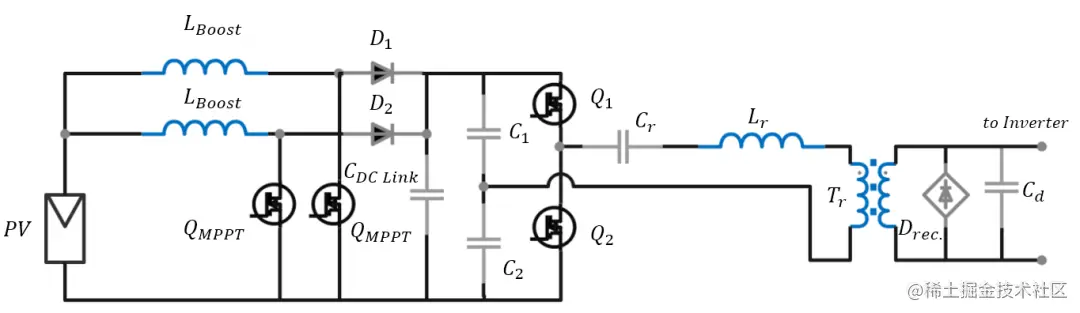 光伏发电作为电流源,其功率输出与工作电压之间存在波动关系,即在实际功率转换中,首先需要实现最大功率输出的控制。根据 MPPT 或 Power Optimizer的算法,波动的光伏发电通常先转换为直流电,即直流母线(或 DC-link)。这个过程一般是boost转换。其次,根据不同的功率等级,升压转换还可以通过交错升压或全桥控制实现更好的效率和更低的成本。同时,可根据隔离要求补充软开关或其他隔离电源转换,实现不同电压的直流要求;或者根据应用的需要可以通过全桥逆变的形式直接供给交流负载。