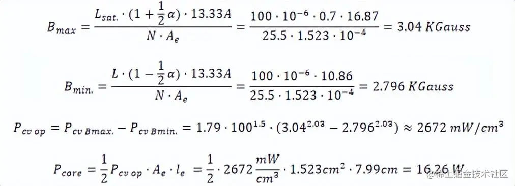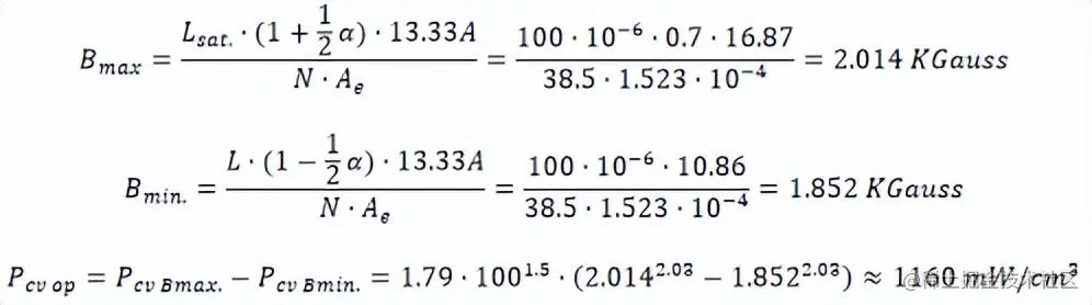 以例2为例,假设所选磁芯提供的有效横截面积为Ae,有效磁路长度为le。如果最小电感下允许的最大电感电流为它的饱和电流,则其最大工作磁通密度为: