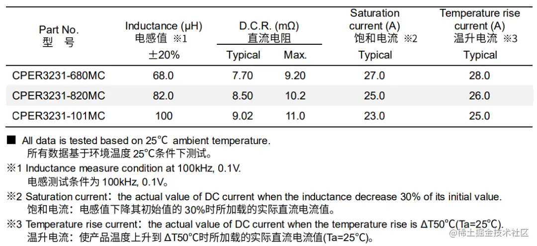 以例2的科达嘉电感CPER3231-101MC为例,规范书列出了由制造商定义的关键参数,如下图所示,