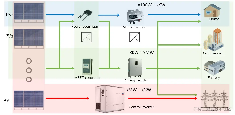 以设施等级为划分依据,太阳能应用通常分为三类:住宅,x100W~xKW;商用,xKW ~ xMW;公共事业,xMW ~ xGW。由于太阳能应用广泛,且具有可扩展性,太阳能发电的相应功率转换有几种不同的方案可供选择: