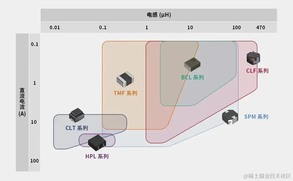 TDK 的功率电感器可在各种电感和额定电流组合中使用。每种产品的特性范围都在上图中用一个彩色区域表示。