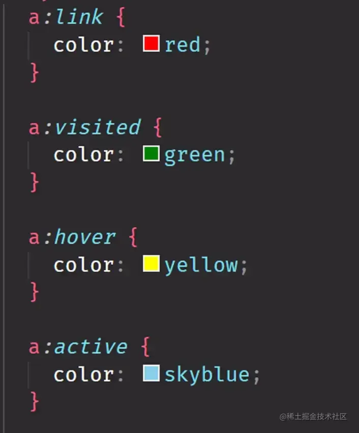 第一个:鼠标点击前,使用冒号和link连接 (:link);代表:鼠标没有操作元素时,元素的默认样式.