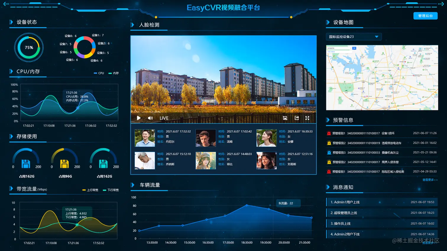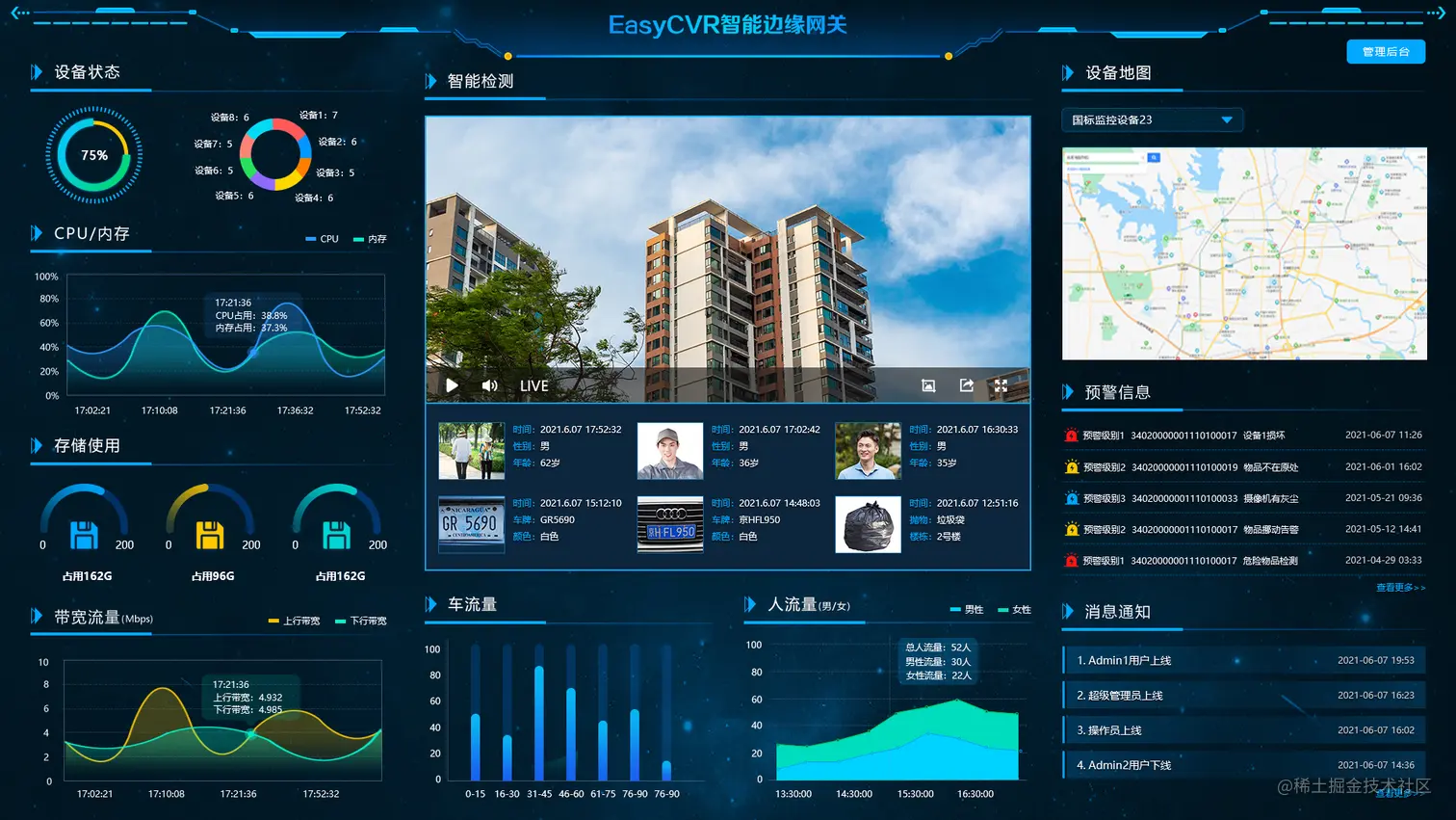 保留小区的数字摄像机,将原有的NVR硬盘录像机重新接入EasyCVR视频融合管理平台。EasyCVR平台支持多协议、多设备类型接入,能兼容多类型的前端监控等设备,利旧场景好,在项目实施过程中,按照利旧的方式来改造,并融合到整网中。无需大批更换设备,不仅简化了系统的实施过程与实施难度,大大节省了系统投资,而且在管理与维护也无需消耗更多精力。
