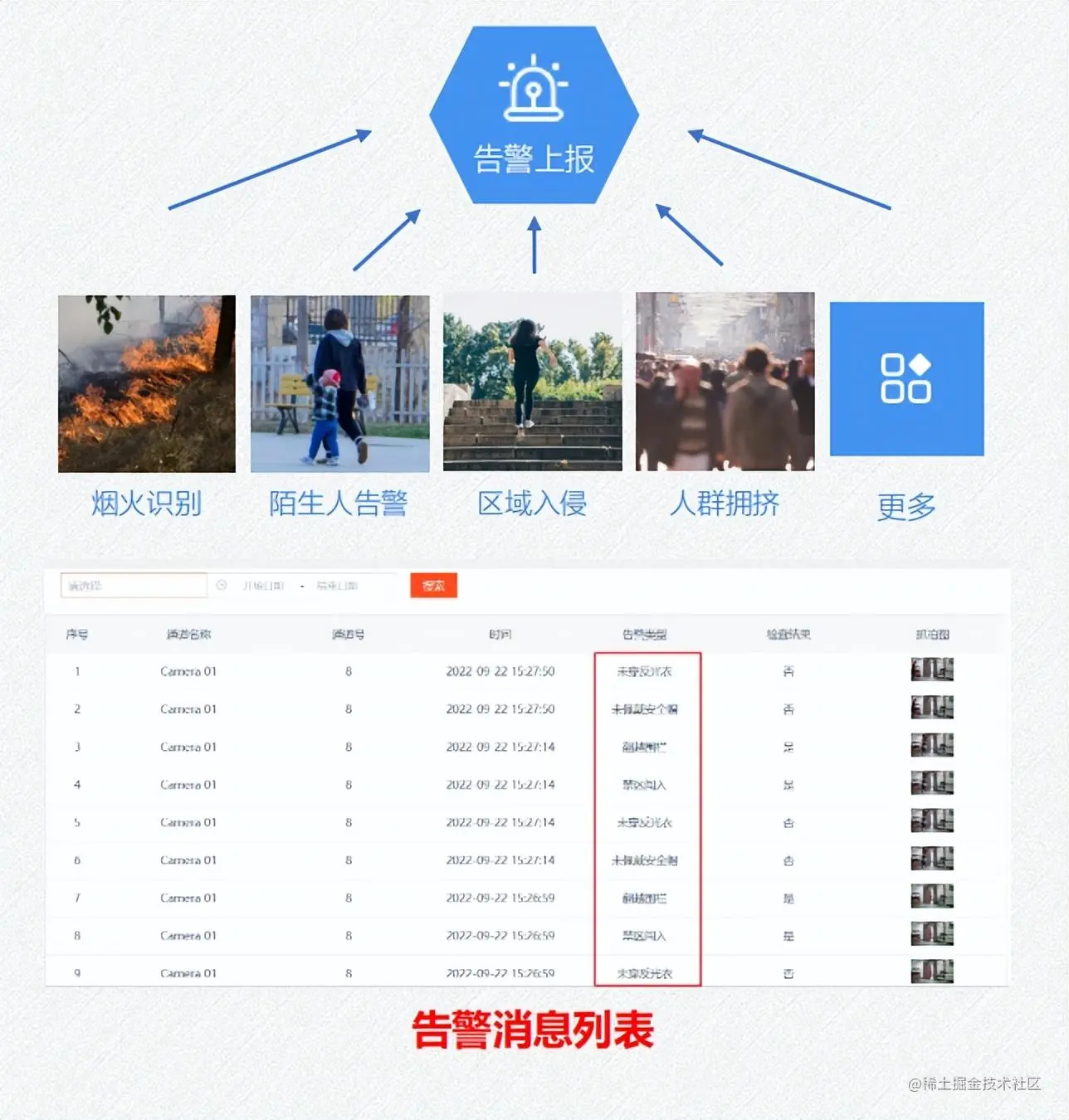 通过对实时视频画面的AI分析,如火灾、打架、人群聚集、非法入侵等行为进行实时智能报警。