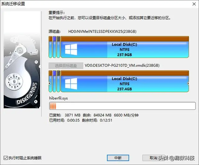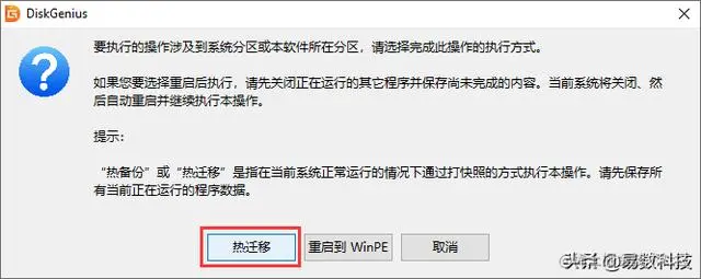 这里选择"热迁移"。DiskGenius提供两种系统迁移方式,即"热迁移"和"重启到WinPE",这里推荐选择热迁移。对系统进行热迁移,在系统正常运行的情况下就可以完成操作,并且无须关闭其他正在运行的软件等,非常方便。