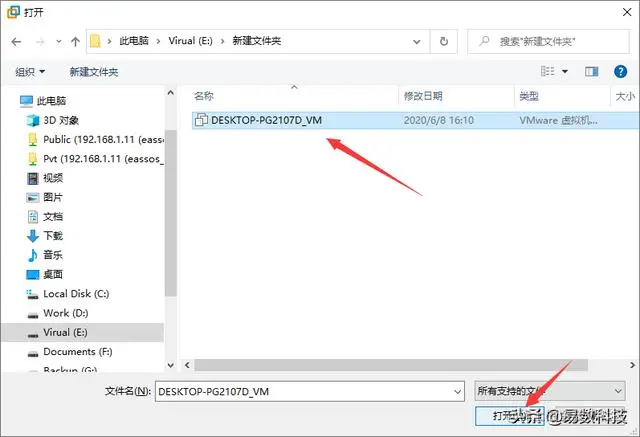 浏览电脑上的数据,找到并选中刚刚创建的虚拟机,然后点击"打开"按钮。