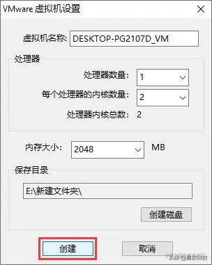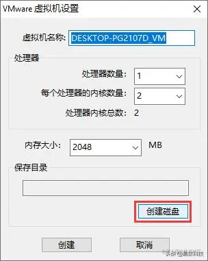 首先,需要设置虚拟机名称、处理器数量、每个处理器的内核数量以及内存大小。关于这些设置,软件根据电脑的配置给出默认的数值,对于不熟悉这些设置的用户,按照默认设置即可。然后,点击"创建磁盘"按钮,为虚拟机创建虚拟磁盘(vmdk文件)。