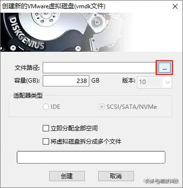 在弹出的"创建新的VMware虚拟磁盘(vmdk文件)"窗口上,点击文件路径输入框旁边的设置按钮,为虚拟磁盘文件选择存放路径。
