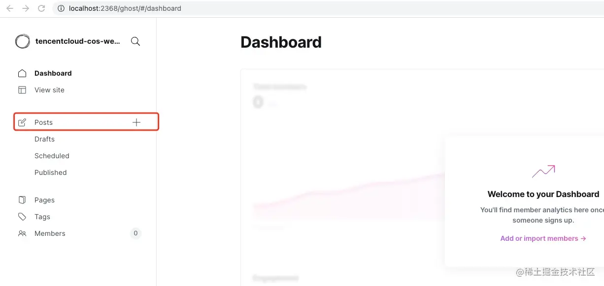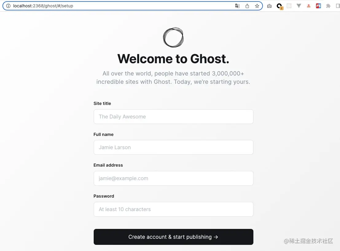 打开浏览器,进入 localhost:2368,出现注册页面,注册后进入管理后台。
