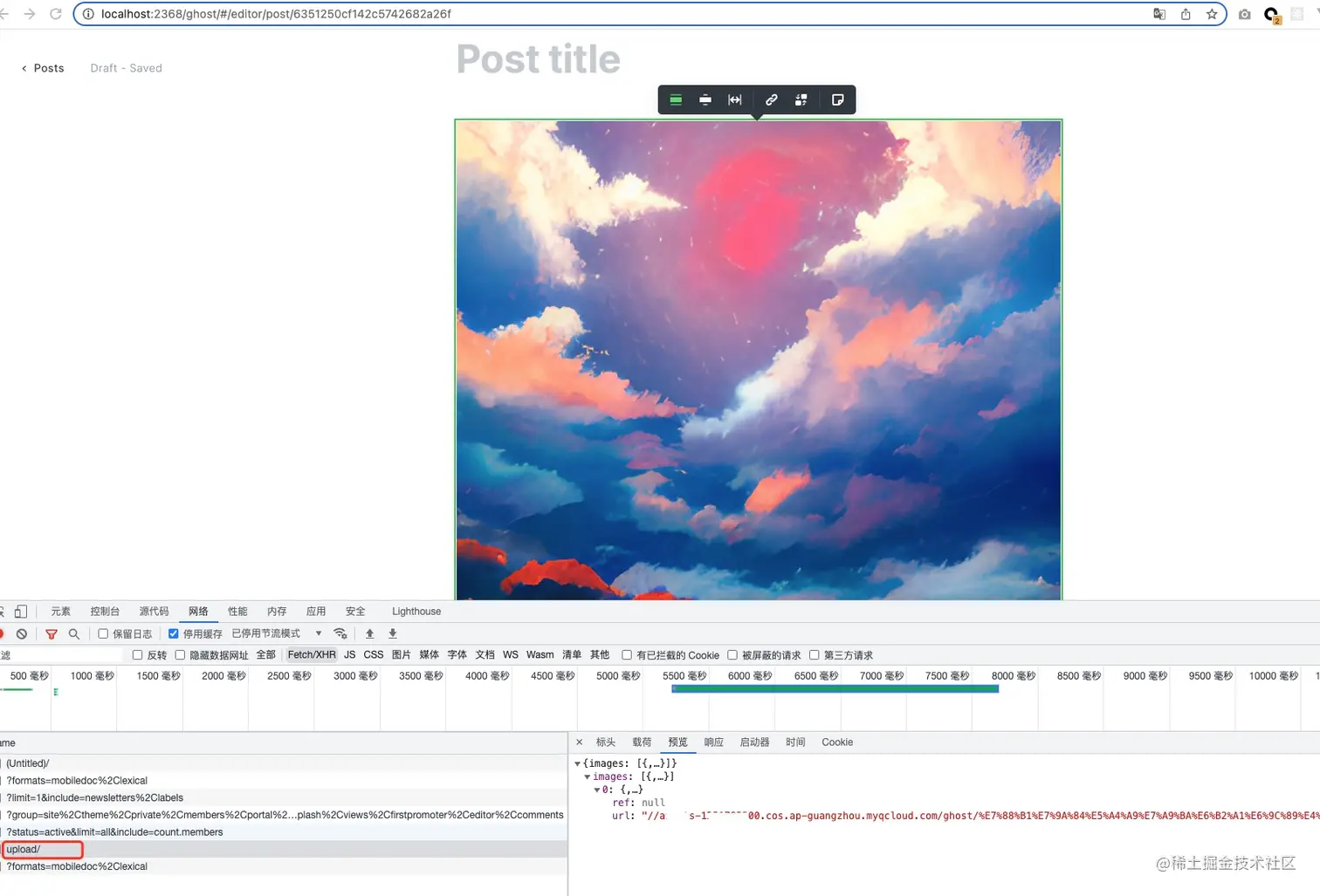 - 单击上传图片,在浏览器抓包可以看到 upload 请求成功,并返回了图片对应的 COS 链接。