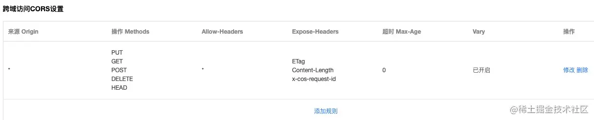 - 单击安全管理 > 跨域访问 CORS 设置,添加一行跨域设置,为方便调试可使用以下配置,操作指引可参见 设置跨域访问。