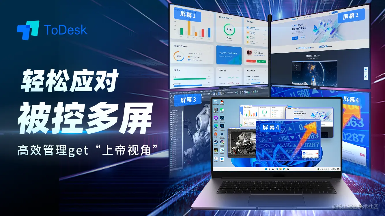 针对更习惯多个显示屏协同操作的代码开发程序员,ToDesk还增加了多屏操作和虚拟屏功能,如程序员在多屏控多屏的情况下,可使用多屏操作功能,连接成功后被控的几个屏幕都能在主控这边全部展现,可以同时兼顾IDE、监视器、文档、网页。