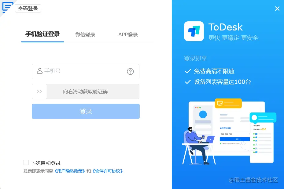 ToDesk和向日葵只需要注册登录就能使用。ToDesk可通过手机验证、微信扫码、APP扫码和账号密码这4种方式登录使用,并且可选择「下次自动登录」,使用起来步骤简单,操作便捷。
