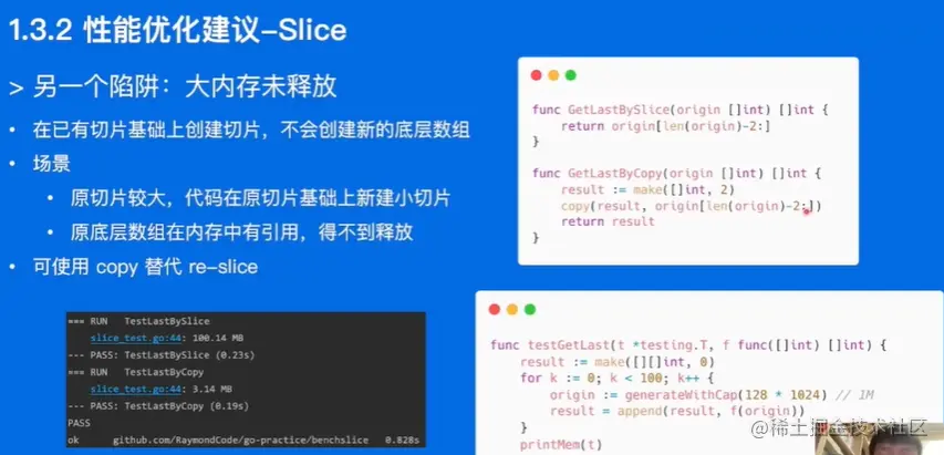 大内存未释放,在一个已有的切片上进行切片操作的话,不会创建新的底层数组,如果原来的切片不使用了,推荐使用copy(target,origin[:2]),而不是直接在原始切片上进行操作(slice)