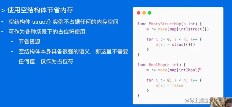 使用空结构体。可以现一个set。使用布尔变量也可以实现一个set。但是他比用空结构体多一个字节。结构体它这里不需要有任何语义。不需要有任何值,仅作为占位符。