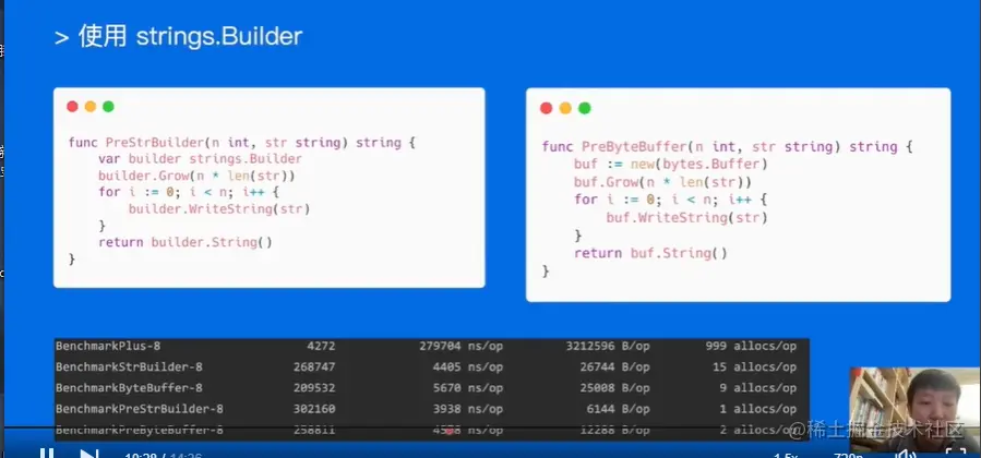 因为string是不可变类型,占用你村是固定的,使用+每次都会重新分配内存。另外两个的底层都是[]byte数组,内存扩容不需要每次都重新分配内存