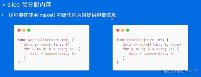 尽可能在初始化的时候提供容量信息,这样会避免多次进行分配(slice,map)