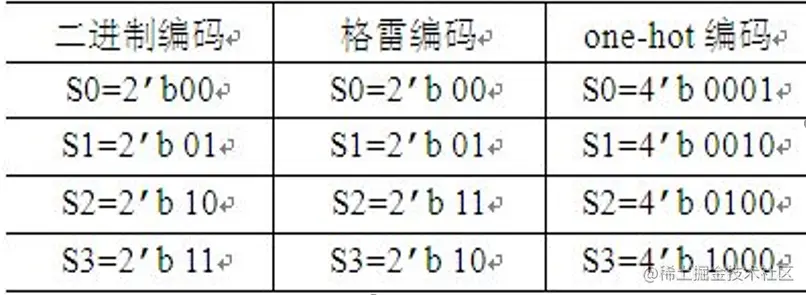 二进制编码的优点是使用的状态向量最少,但从一个状态转换到相邻状态时,可能有多个比特位发生变化,瞬变次数多,易产生毛刺。