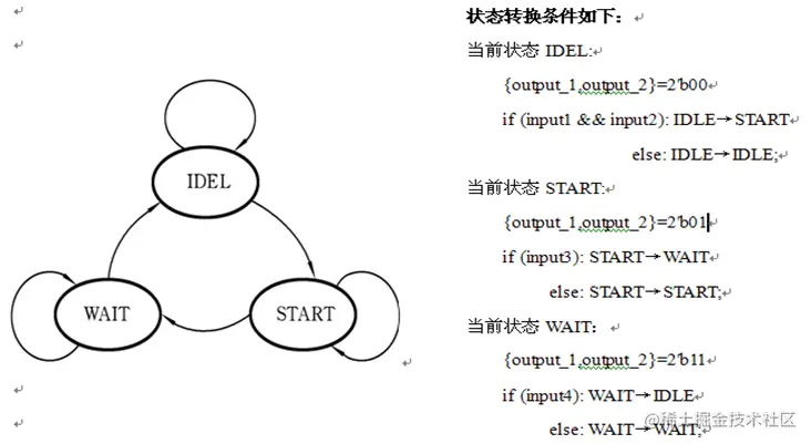 下面以图所示的状态图说明在状态位里编码输出的方法。图中,状态机共有三个状态:IDLE,START和WAIT,输入信号为:input_1,input_2,input_3,input_4。这些输入信号的不同逻辑组合就构成了状态之间跳转的条件。