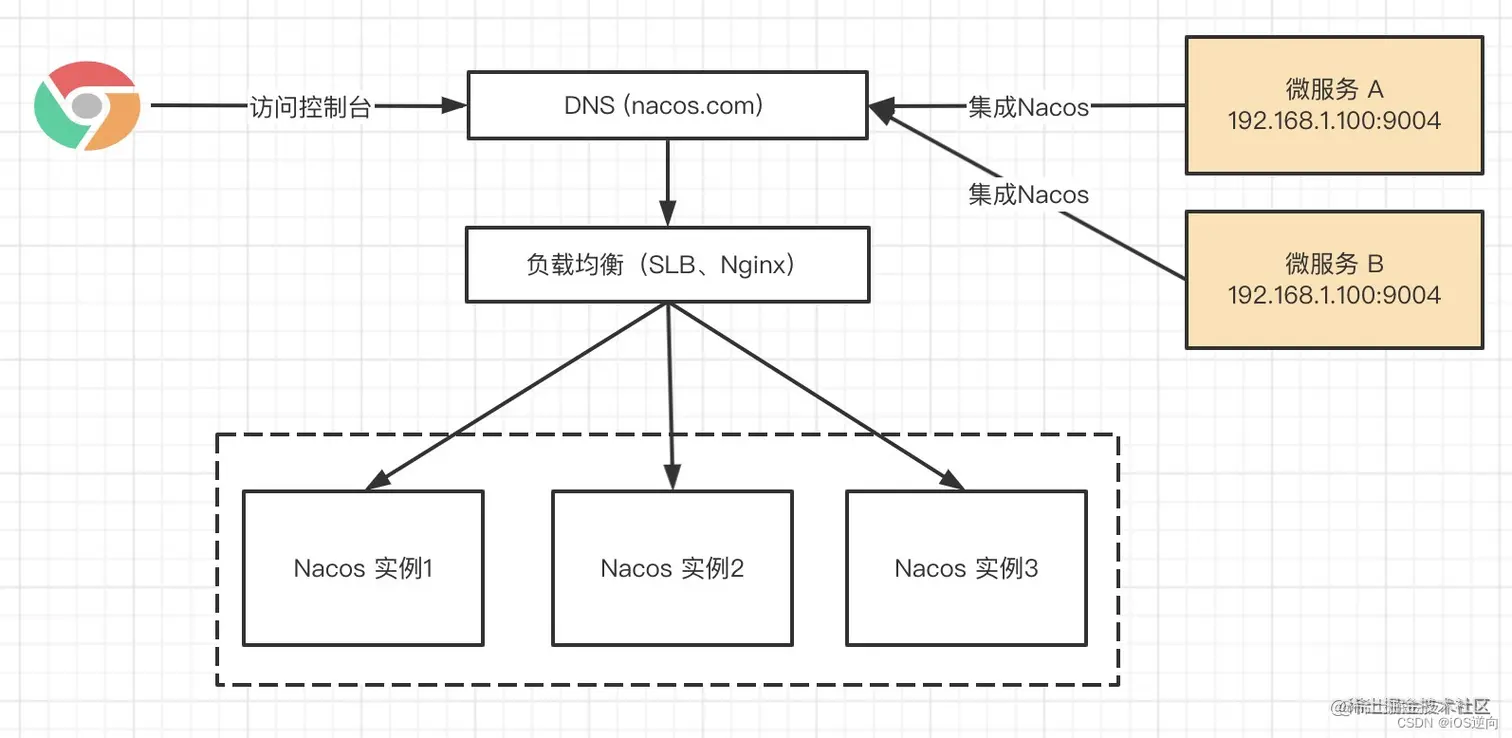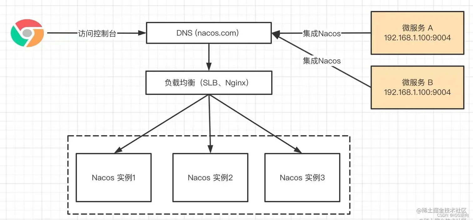 域名是直接解析到负载均衡上,再由负载均衡选择具体 Nacos 实例来进行访问,这种架构也是 Nacos 官方推荐集群模式。