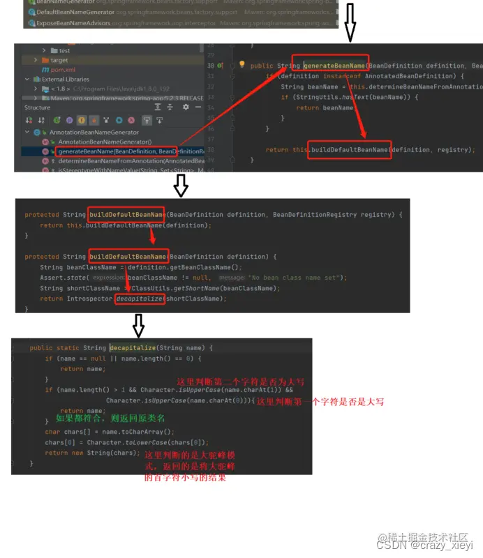 通过前面我们对注解使用,不难发现,我们都是使用的小驼峰。一般来说按照规范,类名我们一般用大驼峰命名,然后我们在使用BeanName的时候,一般用小驼峰,把类名的首字母变成小写。