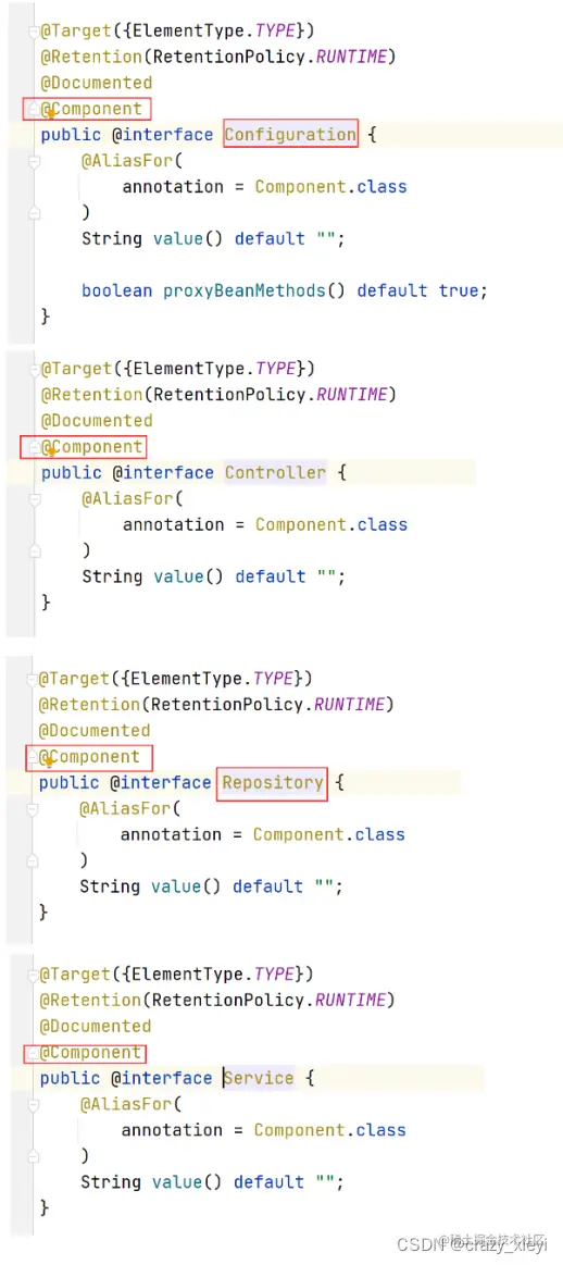 其实不难看出,@Controller、@Service、@Repository、@Configuration都是基于@Component 实现的,所以@Component 可以认为是其他4个注解的父类。