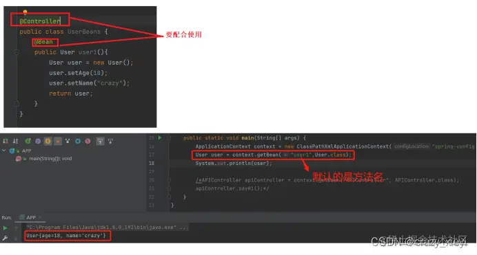 @Bean注解只能用在方法上,而且要注意只使用一个Bean注解是无法将对象储存到容器中的。