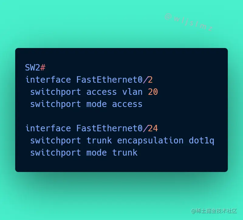 如上配置,两个交换机之间的接口是 802.1Q 中继。