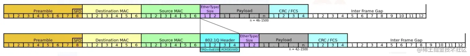在具有多个交换机/VLAN 的较大环境中,可能需要将不同的网络主机分组在不同的 VLAN 上,即使它们不在同一物理交换机上也是如此。VLAN Trunking (IEEE 802.1q) 有助于解决这个问题。该协议为以太网帧引入了 VLAN 标记,将其标记为属于某个 VLAN。