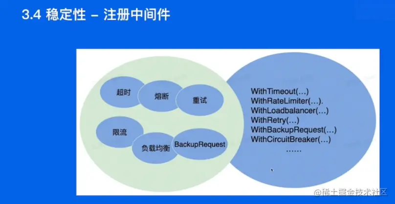 熔断,保护调用方,防止被调用的服务出现问题而影响到整个链路(服务雪崩);限流,保护被调用方,防止大流量把服务压垮;超时控制,避免浪费资源在不可用节点上。