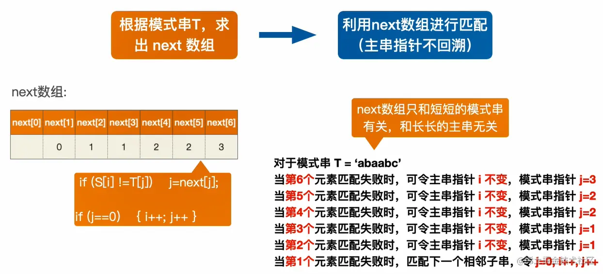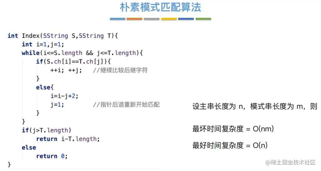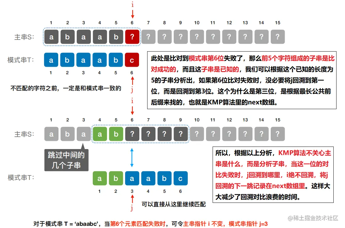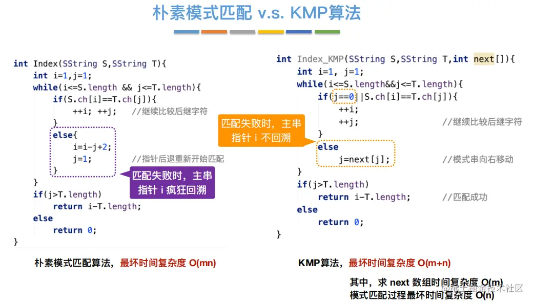 朴素模式匹配算法中,主串与子串在后面对比失败后,都进行了大量的回溯,主串回溯到下一个字符与子串从头进行对比。