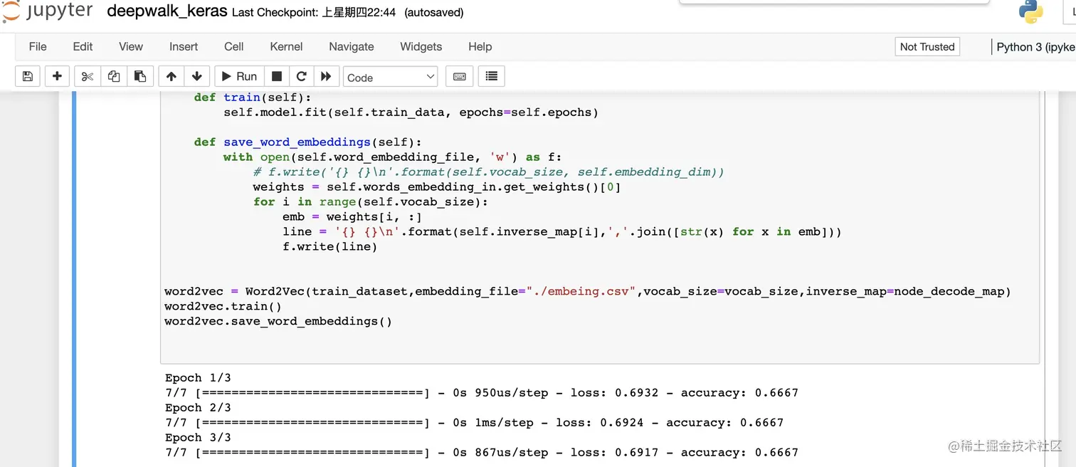 注意这里的导出 节点embeding 的方法, weights = self.words_embedding_in.get_weights()[0] 这里直接取出了 words_embedding_in 作为 embeding 。