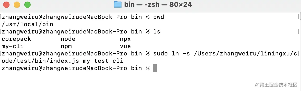 - cd 到vue命令所在目录, 使用ln命令创建一个软链接, 如创建一个名为my-test-cli