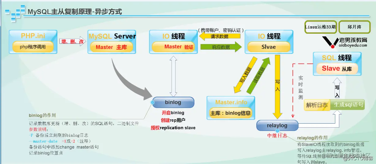 4、slave服务器收到bin-log日志内容,将bin-log日志内容写入relay-log中继日志,创建一个master.info的文件,该文件记录了master ip 用户名 密码 master bin-log名称,bin-log position。