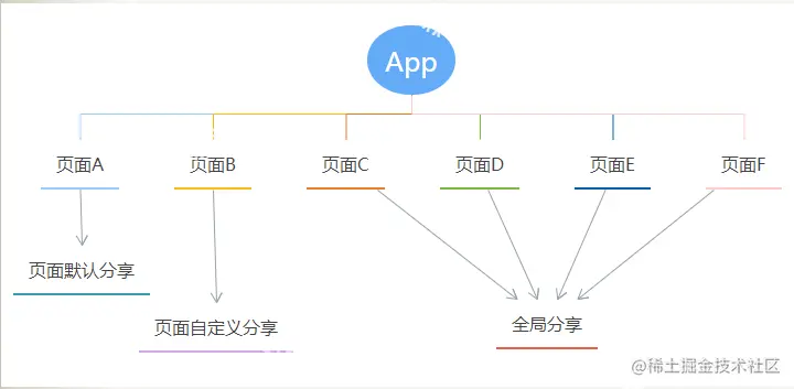 本例结合隐式路由,可实现全局控制所有页面的分享配置,包括全局分享、页面默认分享、页面自定义分享,如下图所示: