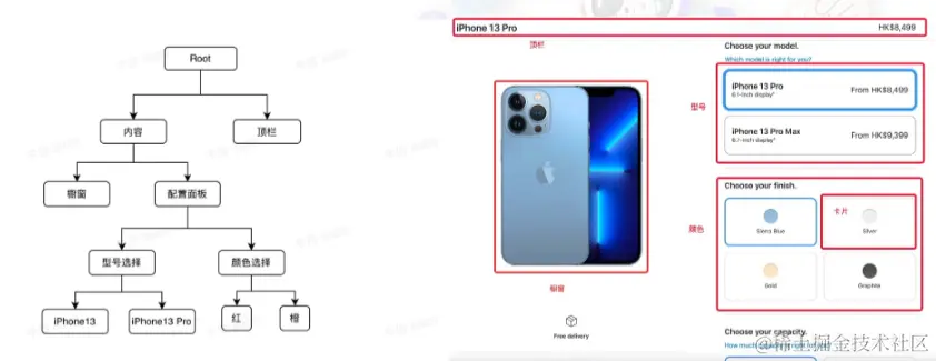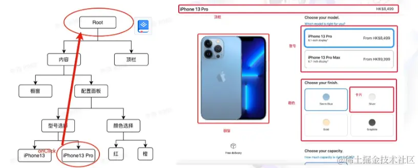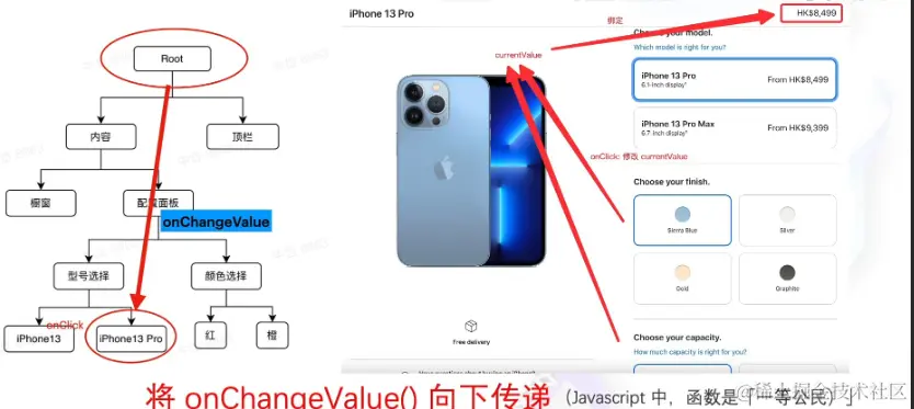 我们看下面这一个图,任何一种配置的改变都会改变价格,改变的价格又必须实时反映在右上角。所以就需要有一个JS变量来存储价格,每次修改配置都要调用回调来修改价格,同时要更新UI,所以要需要挂载onclick事件。