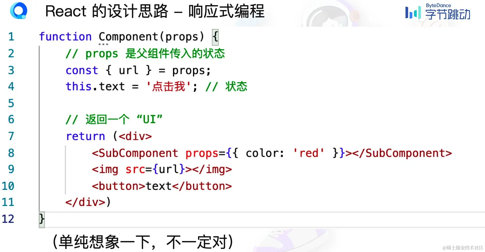 - 之前学过Vue,但是没学过React,这节课最大的收获就是了解了React框架的设计思路,体现了从实际需求出发,这也是我平时需要注意的一个点。