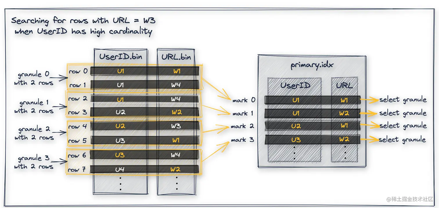 - 数据按照主键顺序一次排序 UserID首先做排序,然后是URL,最后是EventTime