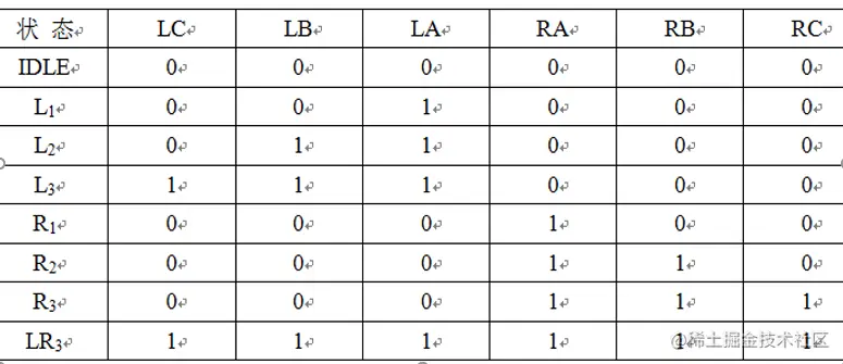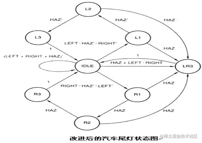 选择Moore机设计该电路,则尾灯的亮、灭直接由状态译码就可以得到。由设计要求可知:汽车左转弯时,右边的灯不亮而左边的灯依次循环点亮,即0个、1个、2个或3个灯亮,分别用L0、L1、L2、L3表示,状态机在4个状态中循环。同理,汽车右转弯时,状态机也会在4个状态中循环,即左边灯不亮而右边的灯有0个、1个、2个或3个灯亮,分别用R0、R1、R2、R3表示。由于L0和R0都表示6个灯不亮,所以合起来用IDLE表示。将6个灯都亮的状态用LR3表示。可得原始的状态图就画出来了,如图所示。