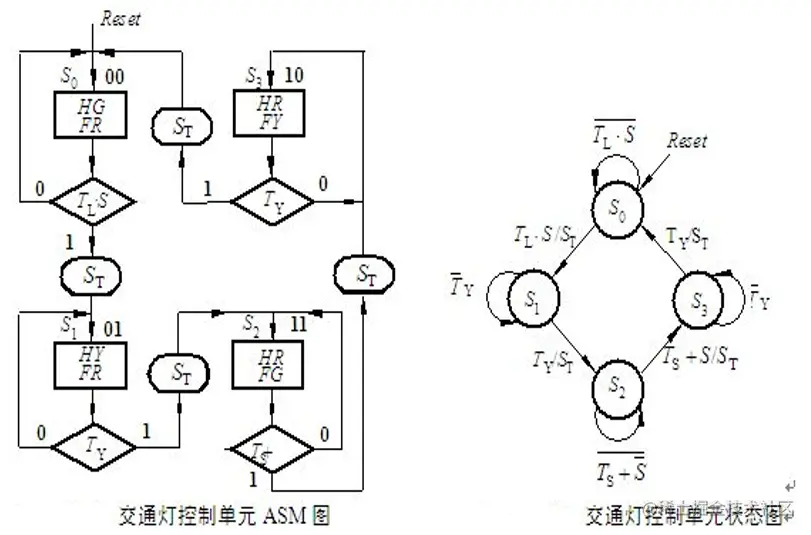 对上述S0、S1、S2和S3四种状态按照格雷码进行状态编码,分别为00,01,11和10,由此得到交通灯控制单元的ASM图如图所示。依此类推得出所示的状态图。