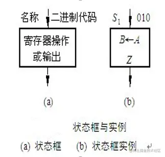 ASM图中有三种基本的符号,即状态框、判断框和输出框。数字系统控制序列中的状态用状态框表示,如图(a)所示。图(b)为状态框实例。图中的箭头表示系统状态的流向。