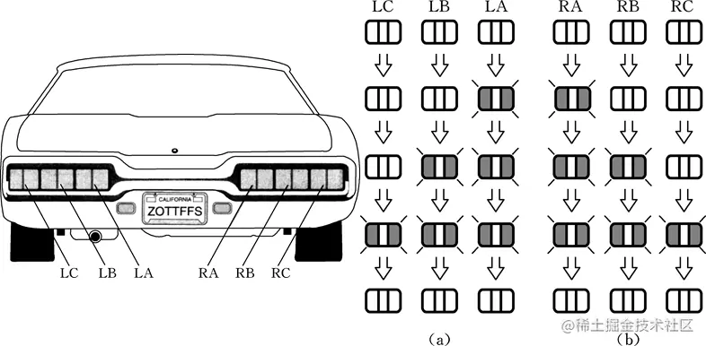 - 右转弯时,右侧3个灯轮流顺序点亮(或按一定频率闪烁),其规律如图(b)所示,左侧灯全灭。