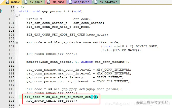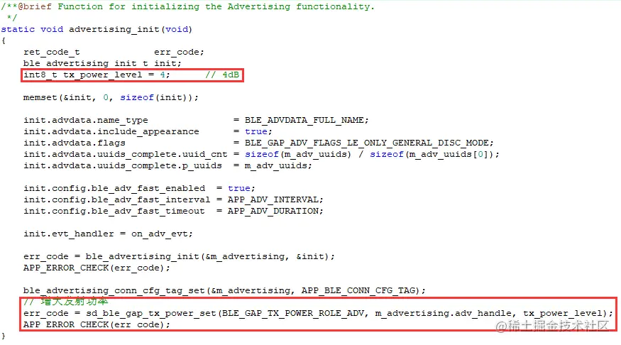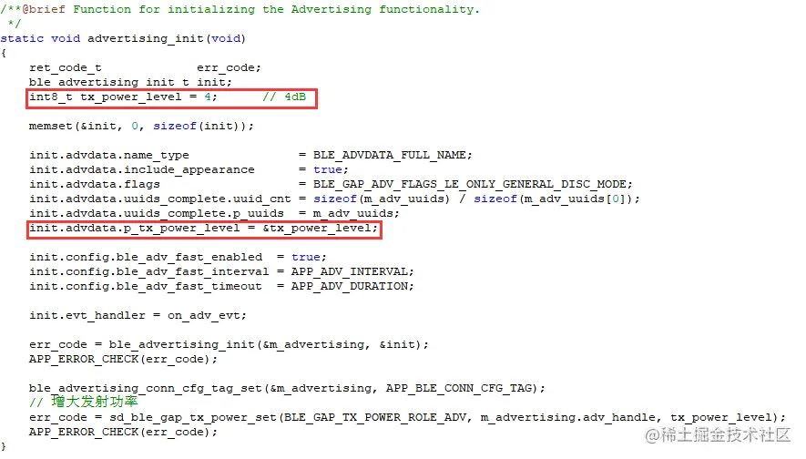 在 GAP 初始化或广播初始化的时候,通过 sd_ble_gap_tx_power_set() 设置发射功率。