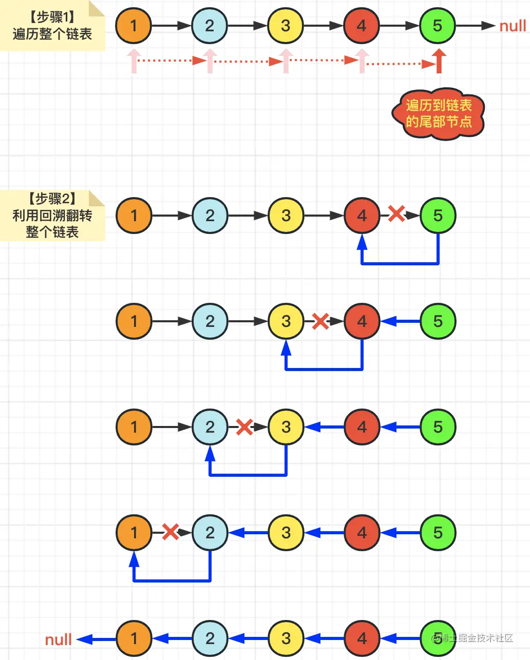 解题思路说完了,我们举例,尝试将Node(1)——>Node(2)——>Node(3)——>Node(4)——>Node(5)这个链表执行翻转操作。具体操作如下图所示: